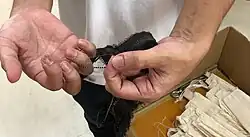 There are two main dyeing processes, one using a dye from the bark of the Techigi tree, and the other, mud. The Techigi tree is cut into chips and boiled down to a thick red liquid. The silk and cotton mats are first dyed in this dye turning them pink, and are then dyed repeatedly in the mud. The fabric goes from a light grey to a reddish brown, and finally to a rich, warm black. The tannin in the dye of the Techigi tree and the iron in the iron-rich mud react to create the black color, unique to Oshima Tsumugi.[15][16]