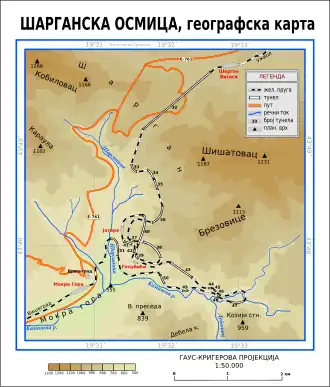 Construction began during World War I and the plan was to connect Serbia with Austro-Hungary, which occupied both Serbia and Bosnia and Herzegovina at the time. Šargan was located 9 km (5.6 mi) away from the pre-war border. The Austrians hastily piled the materials needed for the construction and enlisted numerous Russian and Italian prisoners of war in order to speed up the construction as they were in the hurry.[4][5] Plans were drafted in 1916 and the original, Austrian route differed from the later finished one. They were planning to connect the final station on the Bosnian side, Donje Vardište, to Užice, final station on the Serbian side, which was reached by the railway in 1912. The originally projected route went through the upstream depression, gorges and defiles, or roughly where today the Užice-Višegrad road goes today. It was to swirl along the Kamešina river almost to the top of Šargan.[5]