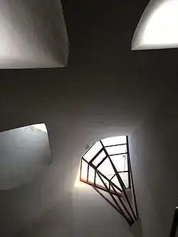 "Its geometrically simple plan encloses a complex, slope-ceilinged, skylit volume, pure, abstract, sparsely ornamented and painted white. The archetypal Bosnian mosque has a simple square plan crowned by a cupola and entered by means of a small porch. The White Mosque's plan conforms to the archetype, but its roof is a freely deformed quarter of a cupola, pierced by five skylights... The effect is one of confrontation between the elementary plan and the sophisticated hierarchy of roof cones. The principal symbolic elements, mihrab, minbar, minaret and fountains, have a fresh folk art character subtly enhanced by the avant-garde geometries of their setting."[3]