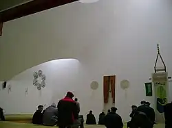 The central space of the mosque is designed both for praying and other religious activities such as lectures and discussions. The indoor area for praying is an annex building. The annex consists of a small auditorium and an office. Traditionally, in Bosnian mosques, graveyards act as a buffer between mosque and other buildings, but in this case, the graveyard is isolated. Architect Zlatko Ugljen used the traditional layout of Bosnian mosques which consist of a courtyard leading to a square praying area, over which rises a cupola. The difference is in an unusual arrangement of this concept, where large glass panels make this mosque more integrated with the rest of the building. Windows with five panels symbolizes Five Pillars of Islam, but also casts light in the interior. The southeast facade of the cupola is faced toward the Ka'ba. Fountains, pulpit and other decorative elements are simple, just like the calligraphy in the interior which is simple and readable. Both the interior and exterior of the mosque are painted white, while the beige color was used for the floor, and green for a few metallic elements, like frames and tubes.