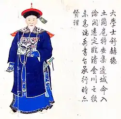 Šuhede entered official life as a bithesi (Chinese: 筆帖式, "clerk") in 1728. He had served as Secretary of the Cabinet (內閣中書), investigating censor (監察御史), Military Secretary of Grand Council (軍機章京), Minister of War, Minister of Revenue, Minister of Justice, Grand Secretary, Grand Councillor and other positions.[1] He had participated in putting down the rebellion of Jinchuan Hill Peoples, the revolt of Amursana, and the Revolt of the Altishahr Khojas. He had made an exceptional contribution in Pacification of "Western Regions" (aka Xinjiang) and Jinchuan, thus his portrait was painted twice in the Hall of Military Merits, known as Ziguangge (紫光閣).[3]