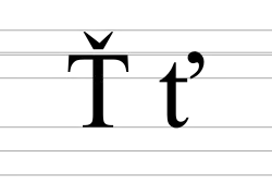 The grapheme Ť (minuscule: ť) is a letter in the Czech and Slovak alphabets used to denote /c/, the voiceless palatal plosive (precisely alveolo-palatal), the sound similar to British English t in stew.[1][2] It is formed from Latin T with the addition of háček; minuscule (ť) has háček modified to apostrophe-like stroke instead of wedge. In the alphabet, Ť is placed right after regular T.