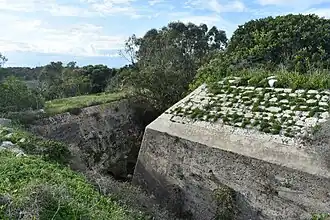 Żonqor Battery was built by the British between 1882 and 1886 at a cost of £5000[1] (or £6000).[2] It has a pentagonal shape, and it is surrounded by a 6 metre wide ditch. The firing positions and ammunition depots were located below ground level to protect them from enemy fire. Its gun crew and garrison were stationed at the nearby Fort Leonardo.[3]