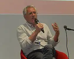 Mann (2010) says that Žilnik "stands freely and independently as a humanist not bound to any political system or state, not bound to the formalities of the industry, and not bound to any conventional form of artistic expression" and that "from the beginning onwards, his films have been defiant, shameless, exaggerated, blatantly ironic, erotic, gory, anti-romantic, antiideal, whistle-blowing, highly taboo-breaking, low-budget, and highly controversial".[16] The scholar Roland Hsu of Stanford University writes that "there is probably no filmmaker who has explored the dynamics of postwar European politics, economy and culture with more persistence and vigor" than Žilnik.[17] His particular style of directing is recognized as pioneering the docudrama or "docu-fiction" genre.[1][2] Many of his films are seen as a prophecy of future events, such as the Breakup of Yugoslavia, economic transition from socialism to neoliberalism, erosion of workers' rights and wider issues related to labor and migration.[18]