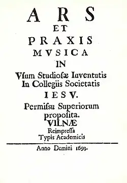 He also has written first textbook of music in Lithuania - The Art and Practice of Music (Ars et praxis musica, 1667, 1693, 1977 in Lithuanian). Common fundamentals of music explained - names of the music notes, a scale, clefs; exercises and church music examples included, plainsong (cantus planus), many-voiced, Gregorian, hard (cantus durus) and soft (cantus mollis) chant modes examined.[1]
