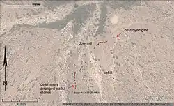 The site consists of a distribution of scattered house ruins, is simple. Downhill to the north-west there is loose row of mostly natural defences, not continuous building. In one spot there is no trace Houses exist despite the lack of a town wall. Houses most dense in the centre of the site. To the south, the cliff above is over 100 m high. From NNE to SSW had to be protected. Main fortification at the NE end. One building sited with niche to the SW side is not a mosque. On W side the fortifications are natural. Between them there are a few wall fragments. A fragmentary gate is visible 20 m south-east of the south-easternmost of the stones. At the north-east of the wall, there was an entrance. Beside it stands an antiquities sign. During a brief stay the team observed 10 Samad Late Iron Age sherds, one or two possible Early Iron Age sherds, but also Muslim period glazed sgraffiato sherds. A few years ago one of the villagers (Khamis Salim al-Rubkhi) submitted a whole Late Iron Age vessel from the site. Six sherds are lodged in the Ministry of Heritage and Culture store, mostly Samad Late Iron Age. The organisation of the houses and the fortifications differ dramatically from the big walls at the sites Jebel Sunsunah, Ibra I0052 or Tiwi TW0002.