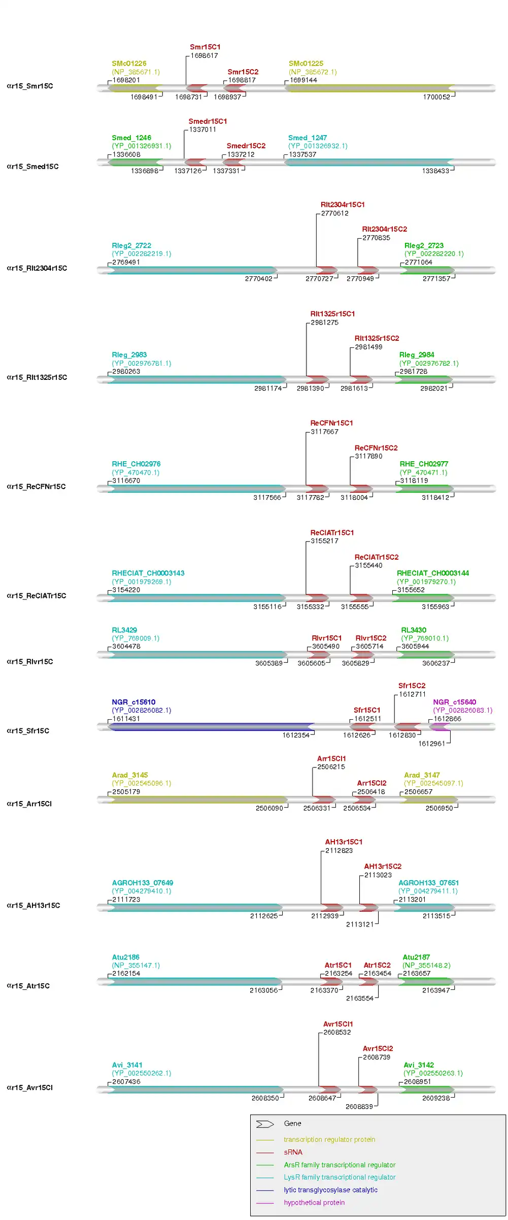 Most of the αr15 family members are trans-encoded sRNAs transcribed from independent promoters in chromosomal IGRs. Many of the αr15 members neighboring genes were not annotated, and thus they were further manually curated.[17][18][19] As a result, we could classify the members of the family in four subgroups according to their genomic context. In the first group are the tandem αr15C1 and αr15C2 loci of the Rhizobium, Sinorhizobium and Agrobacterium species. They exhibited a great degree of conservation in the up and downstream genes, which have been predicted to code for a LysR transcriptional regulator and an AsR transcriptional regulator protein respectively (Figure 5). The only exception in this group was found for S. fredii that presented a very different genomic context. The second group includes the αr15CI1 loci in the Brucella species (additional file 2), which presented a very well conserved genomic context (Aspartate amino transferase and LysR/unknown transcriptional regulator) with partial synteny to the first group. A very different genomic context, not even partially conserved in most cases, was present in all plasmid-borne αr15 loci (additional file 1), which integrates the defined group three, where the flanking genes corresponded to ABC transporter proteins, excisonase or transposase among others. The αr15CI2 loci in the Brucella species (additional file 3) conform the group four and presented an up and downstream conserved genomic context, coding all regions for UDP-3-O-hydroxymyristoyl N-acetylglucosamine deacetylase and GTPAse cell division protein FtsZ. To the last group correspond the αr15CII loci in the Brucella group (additional file 4) where only one of the genes could be annotated always as a glycine deshidrogenase, the other sRNA flanking position was mostly coped by a hypothetical protein conserved in the Brucella group to which no domain, motif or GO functional annotation could be assigned.