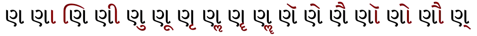 | ण | णा | णि | णी | णु | णू | णृ | णॄ | णॢ | णॣ | णे | णै | णो | णौ | ण् |