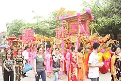There are many shrines and temples dedicated to Ỷ Lan in the northern region of Vietnam, from her village Siêu Loại to the mountainous province Tuyên Quang,[23] a street in Gia Lam near her birthplace is also named in honour of Ỷ Lan.[24] Each year, people in her native district Gia Lam organizes a festival to commemorate the feats of Ỷ Lan on the 3rd of the third month in lunar calendar.[25] A bigger festival to commemorate Ỷ Lan is held in the Ghềnh Temple (Đền Ghềnh) in Văn Lâm District, Hung Yen from 5th to 16th of the third lunar month.[26] In 1997, a national committee was established in order to select a list of distinguished women in history of Vietnam, Ỷ Lan was one of the first choices and the only representative of the list who was well known for her political activities.[27] Besides, Ỷ Lan is also considered the first woman who taught Vietnamese the embroidery technique.[28] In culture, Ỷ Lan is one of the main characters in the chèo play Bài ca giữ nước (The Song of Defending the Country), the most famous work of the writer Tào Mạt.
