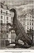 The Japanese word kaijū originally referred to monsters and creatures from ancient Japanese legends;[3] it earlier appeared in the Chinese Classic of Mountains and Seas.[4] There are no traditional depictions of kaijū or kaijū-like creatures among the yōkai of Japanese folklore,[5] although it is possible to find megafauna in their mythology (e.g., Japanese dragons). After sakoku ended and Japan was opened to foreign relations in the mid-19th century, the term kaijū came to be used to express concepts from paleontology and legendary creatures from around the world. For example, the extinct Ceratosaurus-like cryptid featured in The Monster of "Partridge Creek" (1908) by French writer Georges Dupuy[6] was referred to as kaijū.[7] It is worthy to note that in the Meiji era, Jules Verne’s works were introduced to the Japanese public, achieving great success around 1890.[8]