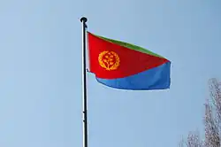The flag of Eritrea (Tigrinya: ሃገራዊት ባንዴራ ኤርትራ, Arabic: علم إريتريا الوطني) is the national flag of Eritrea. It was adopted on 5 December 1995.[1] The flag combines the basic layout and colors from the flag of the Eritrean People's Liberation Front with an emblem of a wreath and an upright olive branch derived from the Eritrean flag from 1952 to 1962.