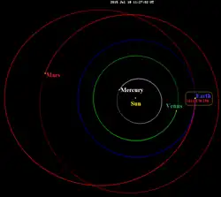 The asteroid has an Earth minimum orbit intersection distance of 0.0020 AU (300,000 km), which corresponds to 0.8 lunar distances (LD). On 19 July 2015, it passed about 2.5 million kilometers from Earth (6.5 LD),[1] attracting the interest of astronomers.[1] The asteroid was listed as level 1 in the Torino Scale on 4 November 2011, 9 days after its discovery, but was removed two weeks later.[9][10]