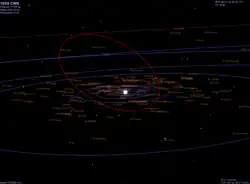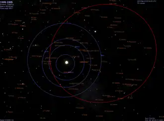 1999 CW8 is an Apollo asteroid that crosses Earth's orbit. It orbits the Sun at a distance of 0.9–3.6 AU once every 3 years and 4 months (1,221 days; semi-major axis of 2.24 AU). Its orbit has an eccentricity of 0.60 and an inclination of 34° with respect to the ecliptic.[2] The asteroid never approaches Earth closer than 0.2 AU in the foreseeable future, but occasionally makes close approaches to Mars of 0.07 AU. It makes one such approach in 2073, at 0.067 AU, and another one in 2103, at 0.094 AU. Due to 1999 CW8's relatively high inclination, although it passes closer to the Sun than the Earth (0.9 AU), it never comes closer than 0.2 AU.
