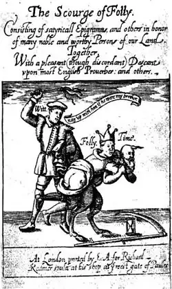 The literary convention that the satirist could wield a whip against "vice" was active at the period in other titles, such as The Whippinge of the Satyre (1601) by John Weever, against the excesses of satire, an anonymous work taken to be aimed at Marston and Jonson, among others. Nicholas Breton's No Whippinge, nor Trippinge: but a kinde friendly Snippinge was a reply of the same year, from another of the presumed targets of Weever.[26][27]
