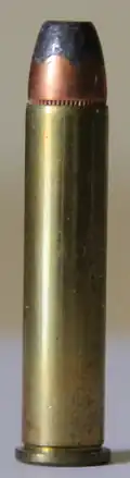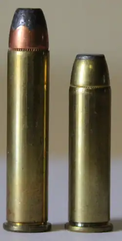 The .357 Maximum, formally known as the .357 Remington Maximum or the .357 Max, is a super magnum handgun cartridge originally developed by Elgin Gates as the wildcat .357 SuperMag.[1] The .357 Maximum was introduced into commercial production as a joint-venture by Remington Arms Company and Ruger in 1983 as a new chambering for the Ruger Blackhawk.[2] Shortly thereafter, Dan Wesson Firearms and Thompson/Center Arms introduced firearms in this cartridge. United Sporting Arms chambered it in their Silhouette series single-action revolvers. It is a .357 Magnum case lengthened 0.300 inches (7.6 mm).[3] Based on the .357 Magnum cartridge, a revolver or single-shot pistol designed for the .357 Remington Maximum will chamber and fire the .360 Dan Wesson, .357 Magnum, .38 Special, .38 Long Colt, and .38 Short Colt cartridges. Intended primarily as a silhouette cartridge, such high velocity and energy levels have hunting applications.[2] SAAMI pressure level for this cartridge is set at 40,000 pounds per square inch (280 MPa).[4][5][6]