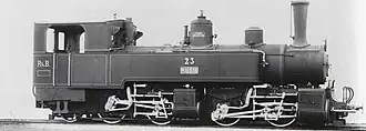 The first Mallet engines of this type were built for the Rhaetian Railway in Switzerland. The steeply-graded metre gauge railway opened initially with conventional 2-6-0T locomotives but soon upgraded to a pair of 0-4-4-0T Mallets. Expansion to Thusis in 1896 needed more locomotives and these were the first two 0-4-4-2T Mallets, with additional water capacity in a well tank at the rear, supported by the trailing truck. The design was not entirely successful and a later batch in 1902 for the extension to reach St. Moritz were built instead as 2-4-4-0T. The earlier locos were then rebuilt to match.[1]