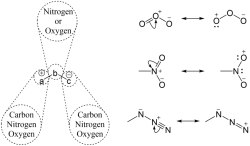 The dipole has at least one resonance structure with positive and negative charges having a 1,3 relationship which can generally be denoted as +a−b−c−, where a may be a carbon, oxygen or nitrogen, b may be nitrogen or oxygen, and c may be a carbon, oxygen or nitrogen.[3]