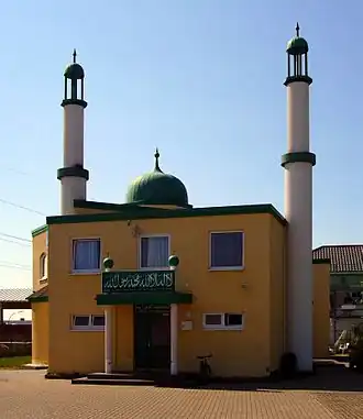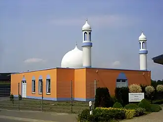 "Mosque of good news“, foundation Oct 1999, completed Mar 2002, plot 2481 m2, prayer hall 129 m2, two minarets 10 m height[3] 52°18′2.3″N 8°0′18.3″E / 52.300639°N 8.005083°E / 52.300639; 8.005083 (Basharat Mosque)[M 5]