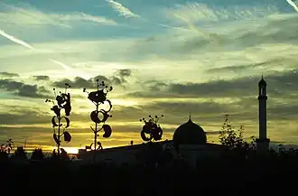 "Mosque of the light of the religion“, named after first Caliph Hakeem Noor-ud-Din, foundation May 2002, completed Aug 2003, plot 2418 m2, prayer hall 331 m2, one minaret 17 m height, 450 members[4] 49°53′6.7″N 8°37′15.5″E / 49.885194°N 8.620972°E / 49.885194; 8.620972 (Nuur-ud-Din Mosque)[M 6]