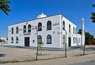 Named after Second Caliph Mirza Basheer-ud-Din Mahmood Ahmad, built before 1989, foundation 22 February 1957, completed 22 June 1957, plot 1,500 m2 (16,000 sq ft), prayer hall 40 m2 (430 sq ft), two minarets at 8 m (26 ft) height 53°35′0.9″N 9°56′36.2″E / 53.583583°N 9.943389°E / 53.583583; 9.943389 (Fazl-e-Omar Mosque)[M 1]