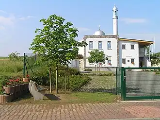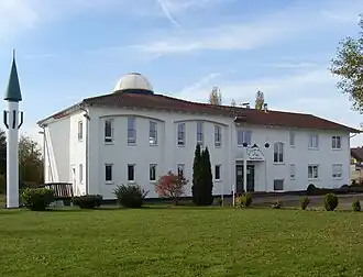 "Mosque of Praise (of God)“, foundation Nov 1998, completed Dec 1999, plot 3500 m2, prayer hall 200 m2, one minaret 10 m height, 600 capacity 49°58′28.2″N 6°56′47.5″E / 49.974500°N 6.946528°E / 49.974500; 6.946528 (Hamd Mosque)[M 4]