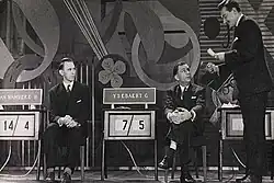 100.000 of niets was originally part of another quiz show, Knal, wie vangt de bal? (Bang, who catches the ball?).[1] It aired on December 11, 1956, and by January 12, 1958, it became an independent weekly show. The programme was hosted by Tony Corsari, Bob Van Bael and Pros Verbruggen and the jury was hosted by Mr. Van Hove, Professor Lucien De Smet and Dr. A.J. Aernouts. In 1959 the show was cancelled. In 1968 it returned to the screen, presented by Pros Verbruggen, Jan Theys and Rudy Samson. Regine Clauwaert was the female guest host.[1]