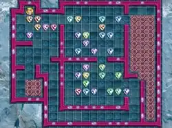 The player can choose from 1001 mazes. There is a coin with an image of a girl or a boy that shows a player's current position and can be moved using both a directional pad and a stylus (by touching arrows visible on the touchscreen). The player can push a crystal in front of them when they move. Only one element can be moved at a time and the positions of the walls cannot be changed. When a crystal is pushed in a corner or two of them are aligned next to each other alongside a wall, they can no longer be moved which causes the player to lose.[2]