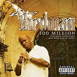 "100 Million" is the second single from Birdman's third studio album, 5 * Stunna. The track features Young Jeezy, Rick Ross and Lil Wayne, and was produced by Cool & Dre. Dre performs the chorus and DJ Khaled performs the intro and outro, but neither of the two are credited. The song discusses what Birdman believes is a major accomplishment: spending 100 million dollars. The song reached number sixty-nine on the Hot R&B/Hip-Hop Songs chart,[1] and number eighteen on the Bubbling Under Hot 100 Singles chart.[2] The song samples Ozzy Osbourne's "Mr. Crowley".