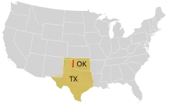 In the United States the meridian 100° west of Greenwich forms the eastern border of the Texas panhandle with Oklahoma (which traces its origin to the Adams-Onís Treaty in 1819 which settled the border between New Spain and the United States between the Red River and Arkansas River). Dodge City, Kansas lies exactly at the intersection of the Arkansas River and the 100th meridian.