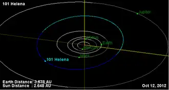 This object is orbiting the Sun with a period of 4.16 years and an eccentricity of 0.14. Its orbital plane is inclined by 10.2° to the plane of the ecliptic. Radar observations were made of this object on Oct 7 and 19, 2001 from the Arecibo Observatory. Analysis of the data gave an estimated ellipsoidal diameter of 71×63×63 ± 16% km. The mean diameter estimated from IRAS infrared measurements is 66 km, in agreement with the radar findings. It is classified as an S-type asteroid in the Tholen system,[3][5] suggesting a predominantly silicate composition. 101 Helena is spinning on its axis with a period of 23 hours.[2]