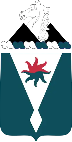 Teal blue and white are the colors formerly used by Aviation units. Participation by the parent unit (4th Aviation Section) in the actions at Whitehorse Mountain, Triangle Hill and Sniper Ridge in Korea is denoted by the three corners of the wedge shape in the center. The projection at its base represents the Kumsong Salient action. The aviation section is credited with eight campaigns in Korea, and these are cited by the estoile (with eight rays) in the colors of the Korean taeguk, further symbolizing award of the Korean Presidential Unit Citation.