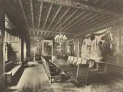 The hallway on floor 3 leads to a group of rooms that originally served as executive offices; Hatch may have designed these rooms. These offices were originally decorated with wooden moldings, a pair of fireplace mantels with garlands, and neoclassical doorways, but these were subsequently modified with linoleum floors and fluorescent lights. The ceilings of these rooms contain caduceus motifs and monograms, similar to those in the hallway, while the windows are deeply recessed and rise from the floor. The south wall of the former committee room included an elliptical arch with a tripartite window.[43] The space occupied by these rooms was converted to residential units 3N and 3P in the 2010s.[5] Floor 3 originally had a room for New York Life's board of directors, which was decorated by Maitland Armstrong.[65] The room was relocated to 51 Madison Avenue in 1928.[65][66]