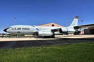 ![]() 108th Air Refueling Squadron – Boeing KC-135A-BN Stratotanker 59-1487 being prepared to go on permanent static display in 1976 SAC livery | |