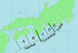 The Nankai Trough delineates a subduction zone along the southwestern coast of Honshu where the Philippine Sea plate subducts northwestward beneath the Amurian plate. This fault zone has been the source of several large megathrust earthquakes in historic times with moment magnitudes of 8.0 or greater. The Nankai megathrust can be divided into three segments from east to west; Nankai, Tonankai and Tokai. These are further segmented into regions A and B for the Nankai segment; C and D for the Nankai segment; and E for the Tokai segment. Another segment west of the Nankai segment is known as Hyuganada (region Z). Scientists have identified patterns in the historic ruptures on the Nankai Trough; the Nankai segment may rupture with the Tokai or Tonankai segments or these segments may rupture in one earthquake. Another pattern involves the Nankai segment rupture separated by up to three years before the Tokai or Tonankai segments ruptures. The return period for Mw 8.5 earthquakes on the Nankai Trough is estimated at 400 to 600 years with the last example in 1707. The 1707 earthquake is the only event to have ruptured all segments of the Nankai Trough though there is uncertainty over whether the Tokai segment ruptured.[2]