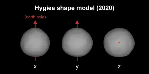 Hygiea is a nearly spherical or ellipsoidal object[46][6]: 137 whose diametric dimensions are 450 km × 430 km × 424 km (280 mi × 267 mi × 263 mi), with an uncertainty of ±10 km (6.2 mi) for the equatorial axes and ±20 km (12 mi) for the polar axis.[6]: 136 It is the second-most spherical main-belt asteroid after Ceres.[5]: 5 The nearly spherical shape of Hygiea suggests it may be in hydrostatic equilibrium, having attained its shape by its own gravity.[6]: 138 Specifically, Hygiea's polar flattening and specific angular momentum closely matches that of a Maclaurin spheroid, which is the shape assumed by a rotating self-gravitating fluid in hydrostatic equilibrium.[6]: 137 [5]: 7