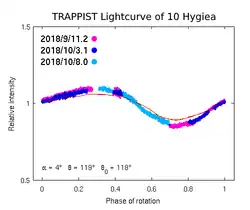 - ^ a b c d Ferrais, Marin; Jehin, Emmanuël; Vernazza, Pierre; Jorda, Laurent; Moulane, Youssef; Pozuelos, Francisco J.; et al. (April 2021). "Lightcurve Based Determination of 10 Hygiea's Rotational Period With Trappist-North and -South". The Minor Planet Bulletin. 48 (2): 166–167. Bibcode:2021MPBu...48..166F.