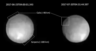 In contrast to the larger asteroid Vesta, Hygiea lacks large impact craters or basins that would otherwise deform its shape from a sphere.[6]: 137 Only two craters on Hygiea have been confidently identified in VLT imaging, with their respective diameters being 180 ± 15 km (111.8 ± 9.3 mi) and 97 ± 10 km (60.3 ± 6.2 mi).[6]: 139 [58]: 11 Both craters appear to have central peaks.[58]: 11 Vernazza and collaborators who studied these images have informally named the larger crater "Serpens" and smaller crater "Calix", after the Latin words for 'snake' and 'cup', respectively.[46][58]: 11 These names, which are not approved by the IAU, were chosen because their eponyms commonly appear in symbols of Hygiea.[58]: 11