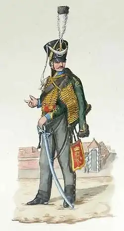 The 10th (Magdeburg) Hussars Regiment (German: Magdeburgisches Husaren-Regiment Nr. 10) were a Prussian Light cavalry regiment of the IV Corps that was formed in late 1813 during the War of the Sixth Coalition against Napoleon after the Battle of Leipzig. The Hussars were a distinctively dressed light cavalry of East European origin.[1] The 10th Hussars were stationed from 1814 to 1884 in Aschersleben and after 1884 in Stendal. They fought in 1866 at the Battle of Königgrätz and later in World War I.
