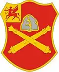 - Shield: Gules, a rock Proper resting on two cannons in saltire Or. On a canton of the last a winged centaur courant holding a bent bow and arrow of the field (for the 6th Field Artillery). And for unofficial use pendant to escutcheon a French Croix de Guerre with gilt star Proper.