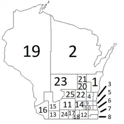 | 19 | Bad Ax, Buffalo, Chippewa, Clark, Crawford, Jackson, La Crosse, La Pointe, Pierce, Polk, St. Croix counties | Manitowoc, Calumet County |