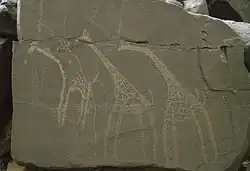 In North Africa, Saharan rock art engravings in what is known as the Bubalus (Large Wild Fauna) period have been dated to between 10,000 BC and 7000 BC.[28] Wall paintings found in Ethiopia and Eritrea depict human activity; some of the older paintings are thought to date back to around 10,000 BC.[29] In Prehistoric Egypt, a culture of hunter-gatherers replaced a grain grinding culture in 10,000 BC.[30] The Abu Madi tel mounds in the Sinai Peninsula have been dated c. 9660 to c. 9180 BC.[31]