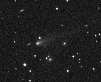The comet appeared as a weak trail at magnitude 16.5 on the edge of its discovery plates, which were taken from the UK Schmidt Telescope of the Siding Spring Observatory.[7] By 22 February, Hartley confirmed his discovery using the same telescope, and found a tail about 10 arcminutes in length.[1] From the Palomar Observatory, both Carolyn and Eugene Shoemaker found two precovery images of the comet about 4.8 hours before its official discovery.[8] By then, it was determined that Hartley's find is definitely a short-period comet.[8]