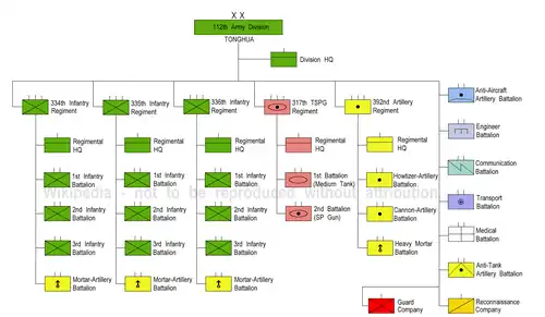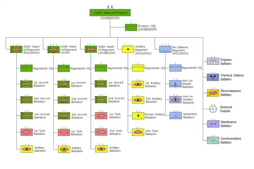 The 112th Mechanized Infantry Division is a military formation of the People's Liberation Army of the People's Republic of China. The 112th Division (Chinese: 第112师) was created in November 1948 under the Regulation of the Redesignations of All Organizations and Units of the Army, issued by Central Military Commission on November 1, 1948,[1] basing on the 1st Division, 1st Column of the Northeastern Field Army. Its history can be traced to 5th Corps of the Chinese Workers' and Peasants' Red Army taking part in the Pingjiang uprising in 1928.[2]