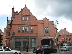 This was a pre-existing building remodelled in 1890–91 by the local architect John Douglas.[4] The work was done for the 1st Duke of Westminster. The building is constructed in red Ruabon brick with sandstone dressings, and has a red clay tile roof. It has three storeys. In the ground floor of the front facing the street is a modern shop front. In each storey are three sash windows, surrounded by ornate stone cases. At the top of the front facing the street is a shaped gable containing blue brick diapering and with stone coping, volutes and five finials. Towards the right corner is a wrought iron sign bracket dated 1890. The side facing the passage leading to Parker's Buildings is built on a high sandstone plinth. It includes a chimney with a shaped stack and a number of stone-dressed windows. To the rear of the building is a two-storey wing.[1]