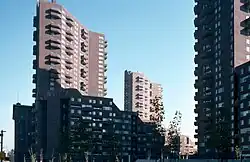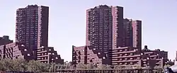 In 1968, a new hybrid plan was agreed upon by the architects and the union. The project would consist of four towers, each 32 stories tall, with 1,594 housing units.[5] These structures would be joined by mid-rise units with a stepped-slope construction which extended toward the riverbank, giving the complexes a distinctive "U"-shape.[5][4] The development would include storefronts, health and daycare centers, a meeting hall, a gym, and a pool.[5] Excellent views of the river, as well as abundant sunlight, were afforded by the design of this complex.[4]