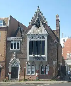 The building has two storeys and two bays facing east towards Dyke Road. The southern (entrance) bay is narrower, shorter and has a very steep hipped roof;[6] a drawing in the architects' journal Building News in 1873 showed a tall flèche on top of this roof.[26] The door is set into an ogee-headed white-painted arch; the tympanum formed by the space between the arch and the door is decorated with carved scrolls and a shield.[6] Around the door, columns terminate in intricate foliated capitals.[10][16] A first-floor window with three lights has similar decoration above. In front of the roof is a cornice and parapet with some decorative scrollwork.[6] The main bay has two pairs of lancet windows on the ground floor and a large, four-light oriel window above. This projects from the surrounding brickwork and also has tall, extremely narrow windows on each side. Above each pane is a panel with tracery described as "highly original"[26] and "of great inventiveness".[6] The cornice above this has gargoyles at the corners, and the roof has a prominent crow-stepped gable.[6][26]