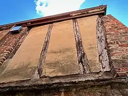 This 17th-century building is constructed from timber-frames, brick and a clay pan-tile roof. The limited 13 feet width of the property was determined by the beam of the Hanse cogs[1] bringing timber from Scandinavia and Poland into the docks probably at Hull or Beverley Beck. This two storey shop had a loading bay above the shop front and a wooden staircase at the rear. The timber framing can be seen along the passageway to the left of the building.