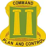 - Description:A gold color metal and enamel device 1+1⁄8 inches (2.9 cm) in height overall, consisting of a green scroll on two gold rollers, unrolled vertically and bearing two upright gold ionic columns all within a continuous gold motto scroll passing behind the green scroll at the sides and arced across the top and base inscribed on the top arc "COMMAND", and on the lower arc "PLAN AND CONTROL", all in black.