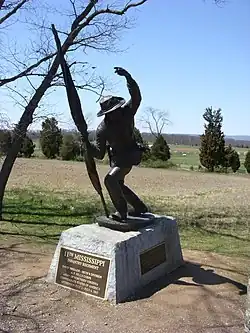 In late 1862, the 11th Regiment was reassigned to the command of General Joseph R. Davis, and was sent north as part of the Gettysburg Campaign in the summer of 1863. During the second day of the Battle of Gettysburg, the 11th fought at Cemetery Ridge, taking heavy fire while charging the Union lines.[2] On the retreat south from Gettysburg, the 11th fought at Bristoe Station and Mine Run before reaching winter quarters in Virginia.