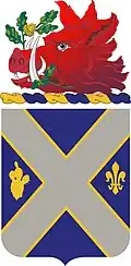 The insignia is a blue shield with a gray saltire cross and a prickly pear and fleur-de-lis, and a boar's Head with an oak branch in its mouth on top. The blue background represents the Infantry while the gray cross symbolizes the unit's Confederate service. The cactus represents duty on the Mexican border, and the fleur-de-lis service in France during World War I. The boar's head with oak branch is the crest of the Georgia Army National Guard.